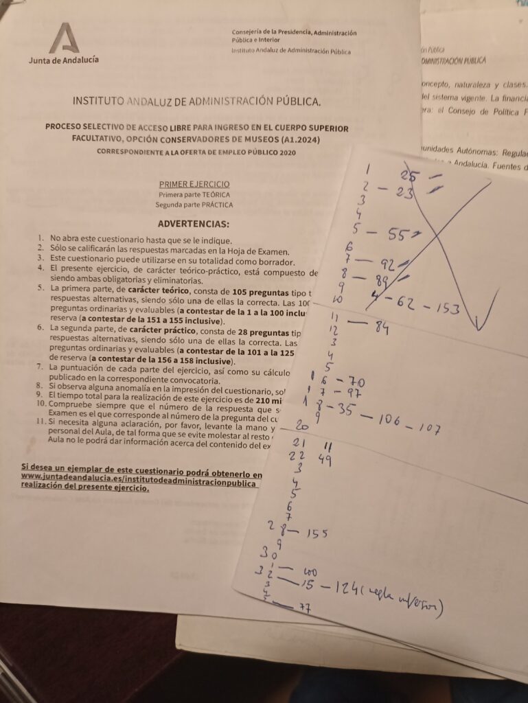 En el ultimo examen de Conservadores de Museos de la Junta de Andalucía, hubo 21 preguntas de los 35 temas que forman la Parte Común del Temario, que deben estudiar todos los futuros facultativos. El examen lo podéis encontrar aquí. La plantilla de soluciones aqui. Si os fijais en la imagen de la foto adjunta, observareis que en esta hoja de trabajo, aparecen los 35 temas y los números de las preguntas que se hicieron de cada uno de ellos. Los Temas 9 y 18 fueron las estrellas, porque sobre ellos se formularon mas preguntas (tres en cada uno de ellos (4, 62, 153 y 35.106 y 107). Proporcionalmente menos preguntas que sobre la parte especifica, pero sin duda ….posiblemente decisivas.